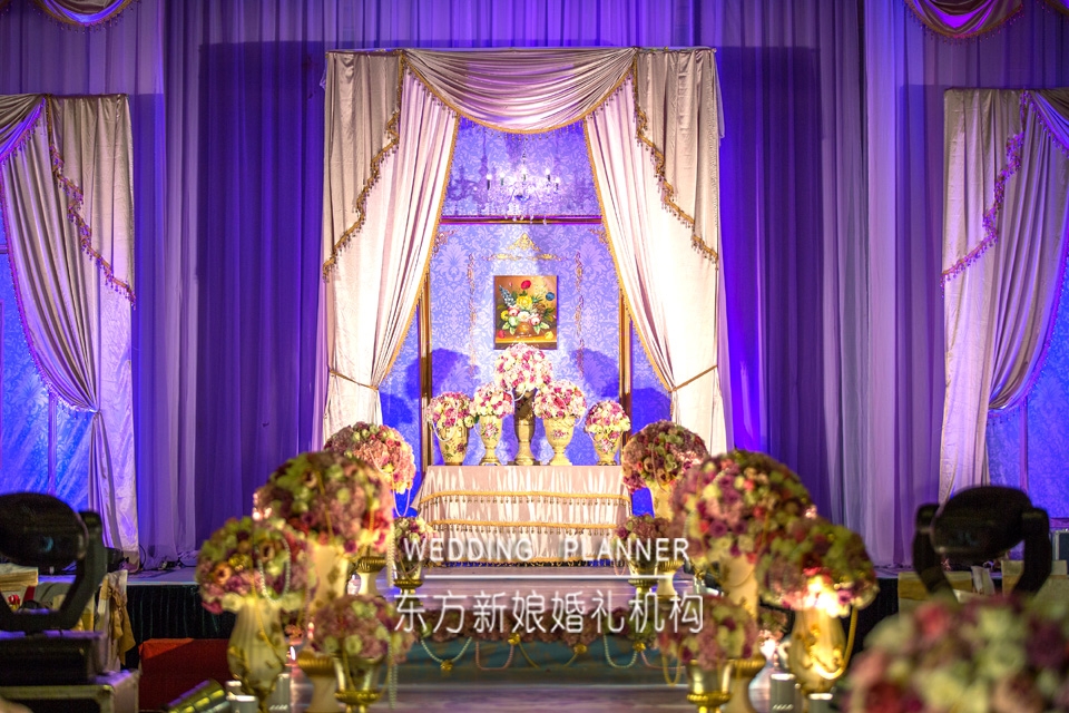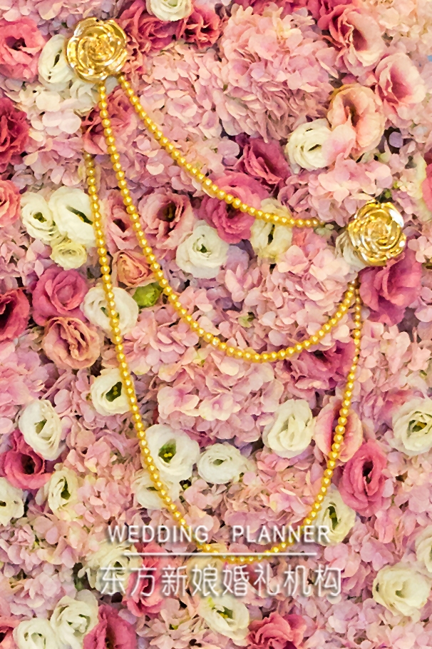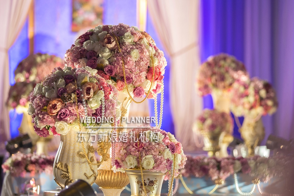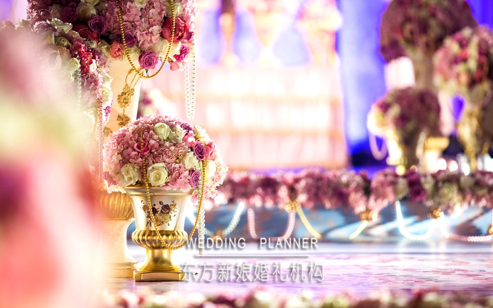 拥有公主梦的新娘希望自己的婚礼既梦幻又有着奢华的气息,洛可可的风格是最好的选择。粉色、金色既梦幻又有着奢华的气息。金色浮雕罗马柱高低错落,渐高式的过道和欧式图案,珍珠和金色玫瑰花的点缀,透着婚礼的奢华和质感。而大量的锻质欧式布艺和金色珍珠流苏诠释了洛可可风格。