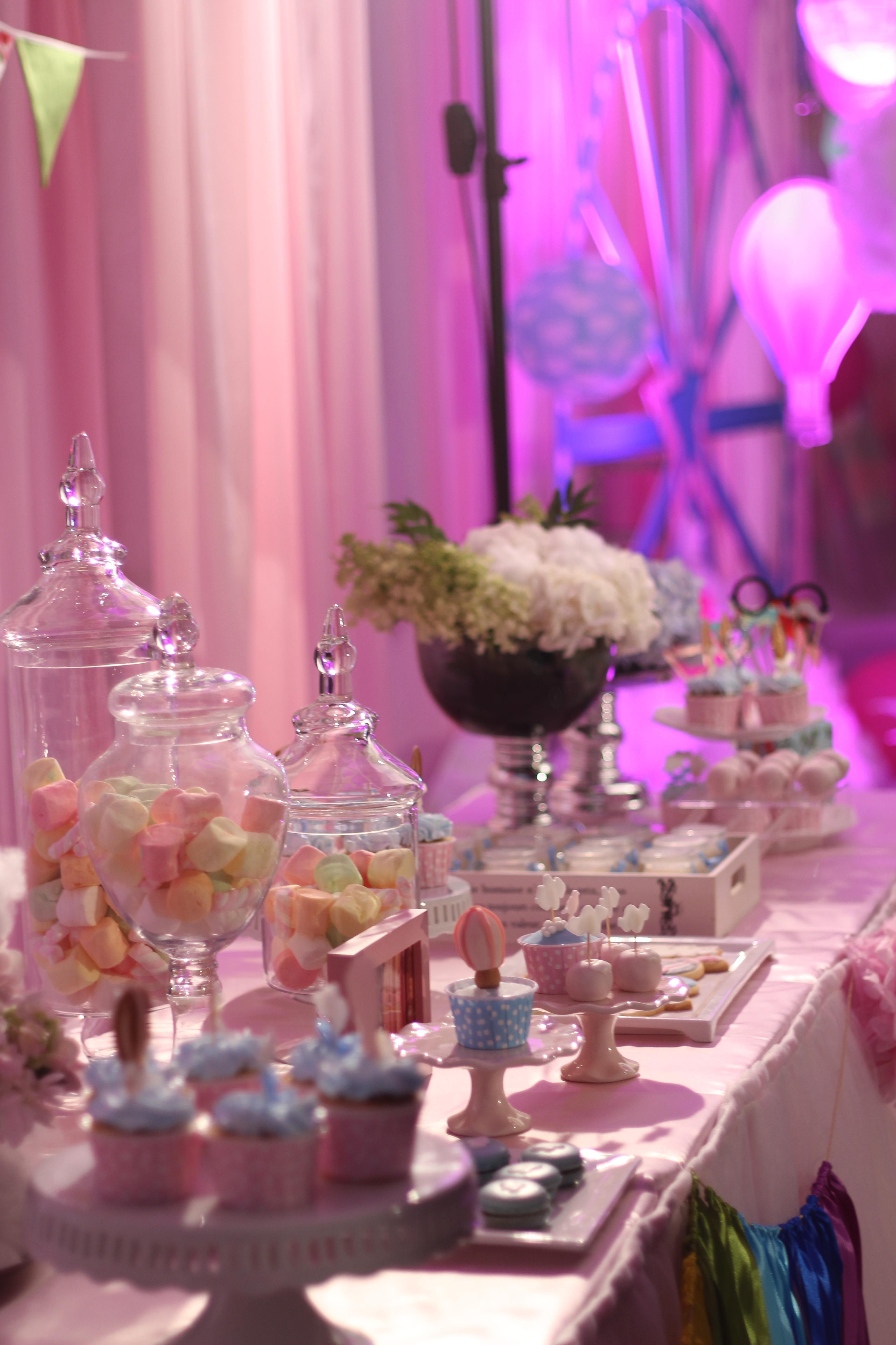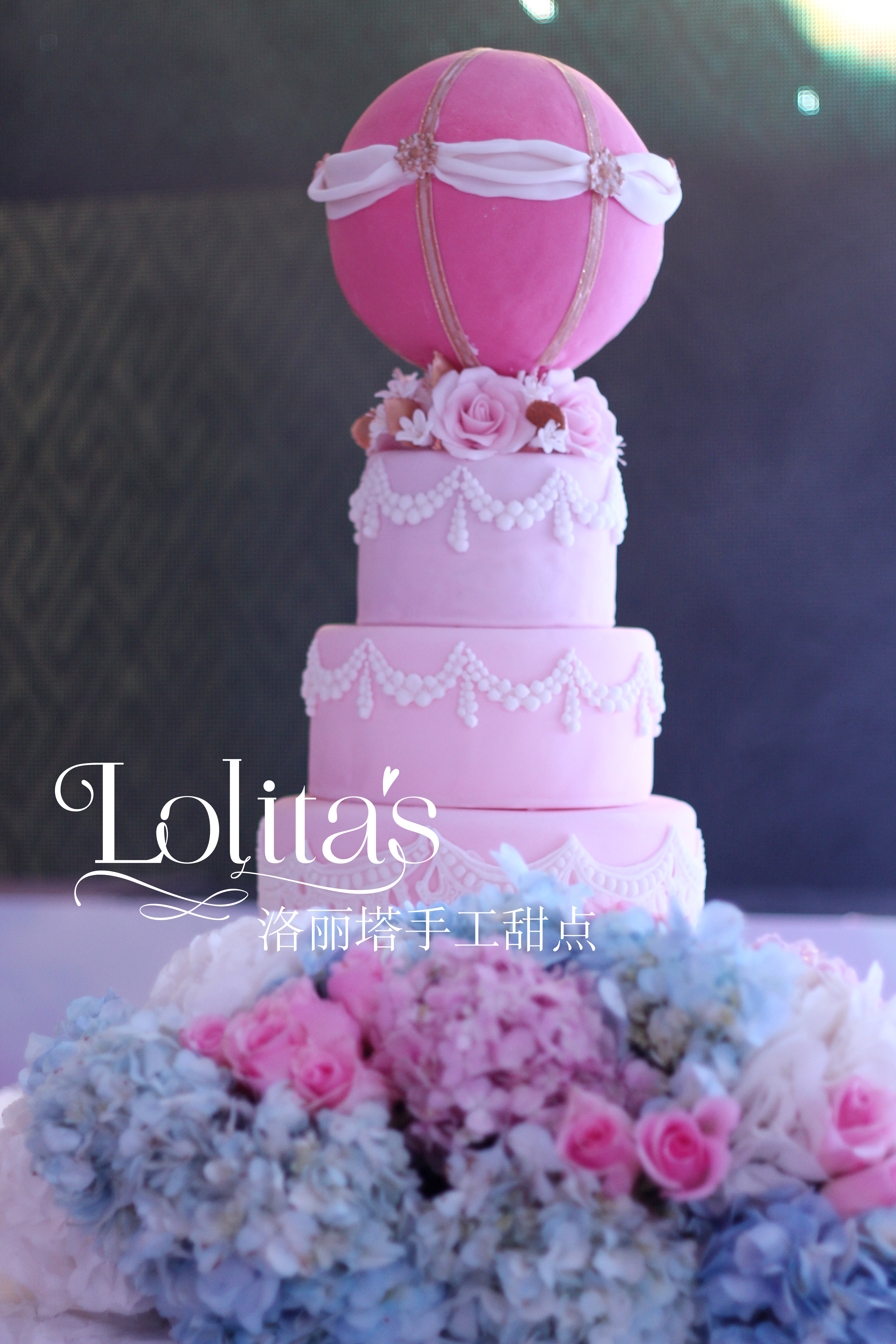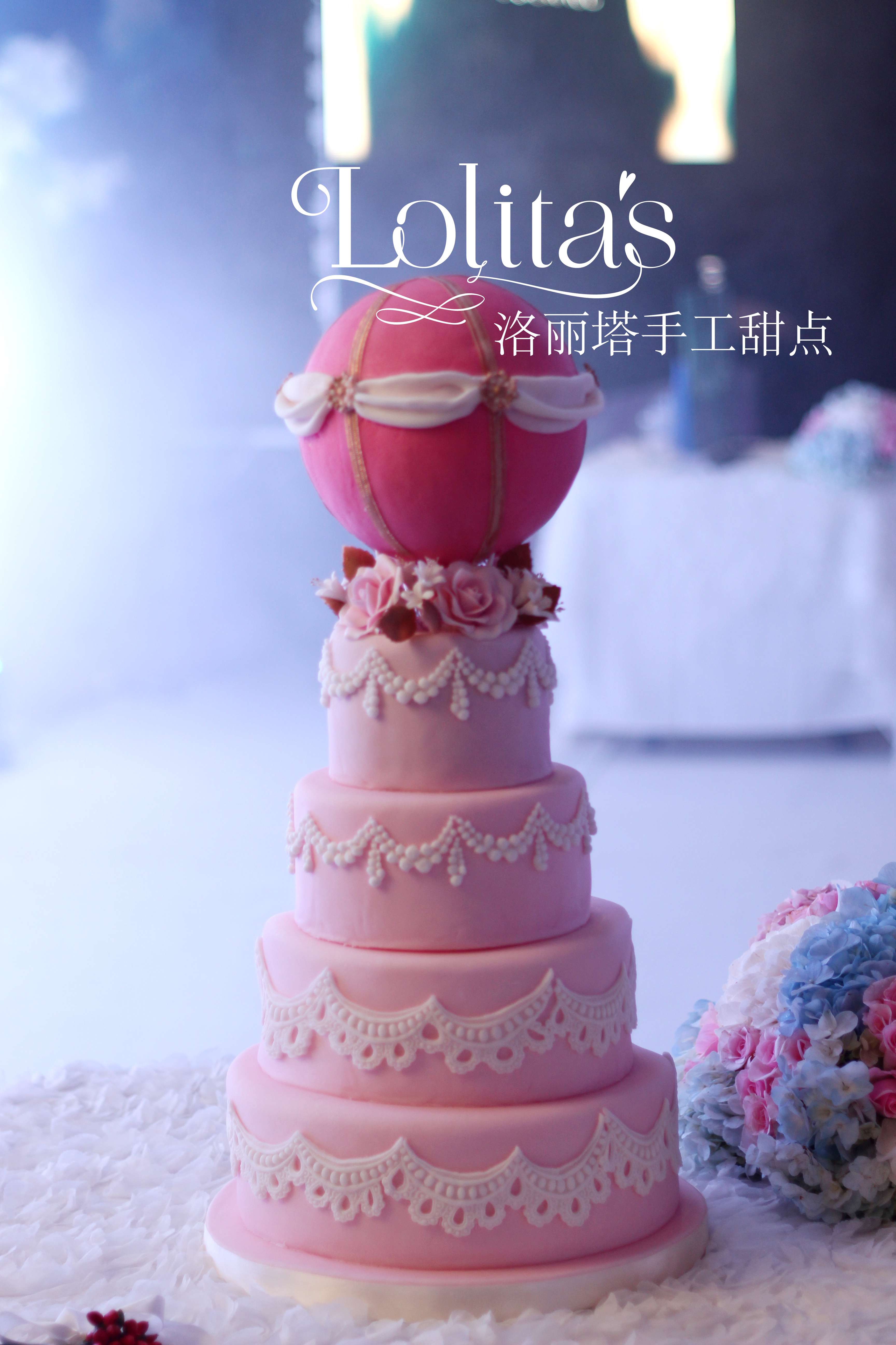 整体甜品围绕着云朵天空的元素,饼干以小鸟云朵和热气球的造型呈现,cupcake整体以粉色蓝色搭配,还加入了一些艳丽的彩虹元素。整体甜品台以棉花作为云朵的装饰,整体呈现出柔美的感觉。主蛋糕是粉色的热气球型蛋糕,顶部热气球下面以花朵作为装饰,五层的高度也很适合大型的婚礼现场。