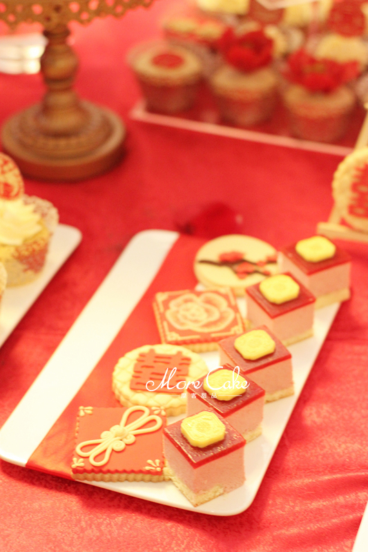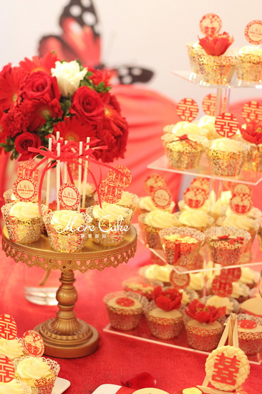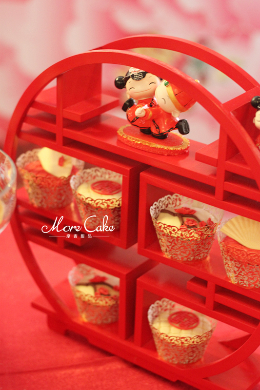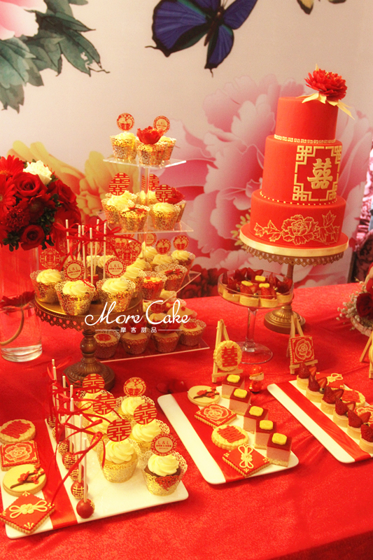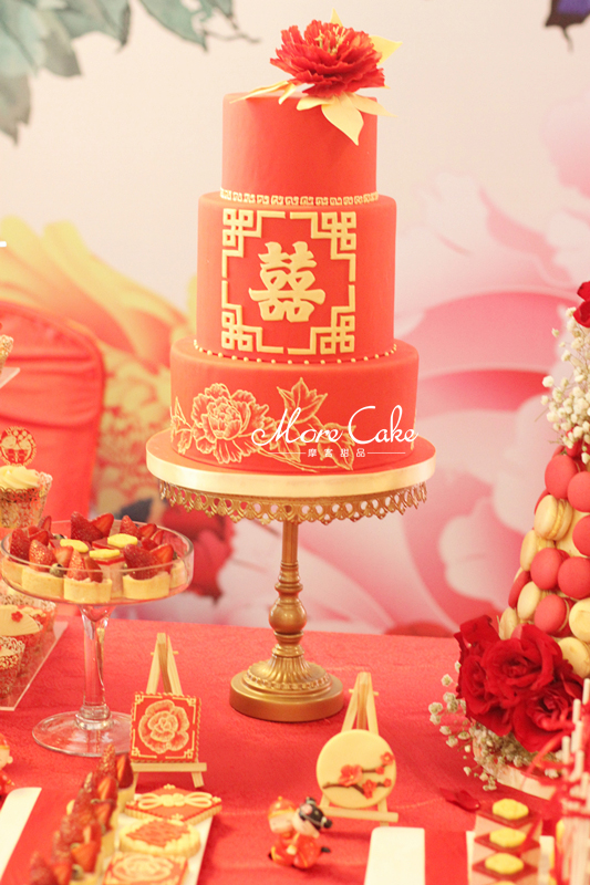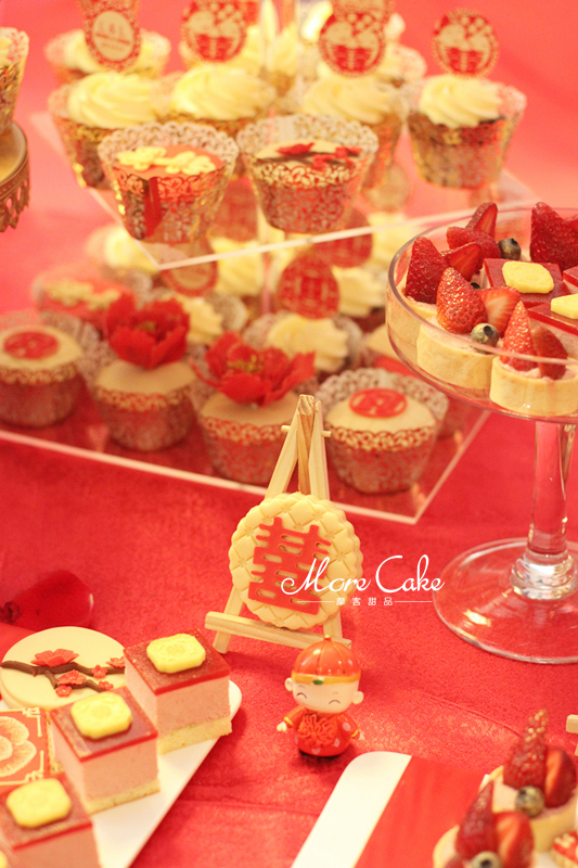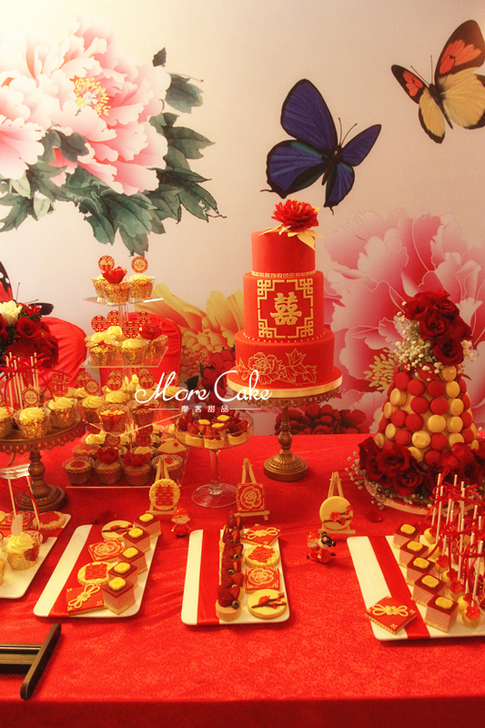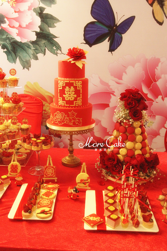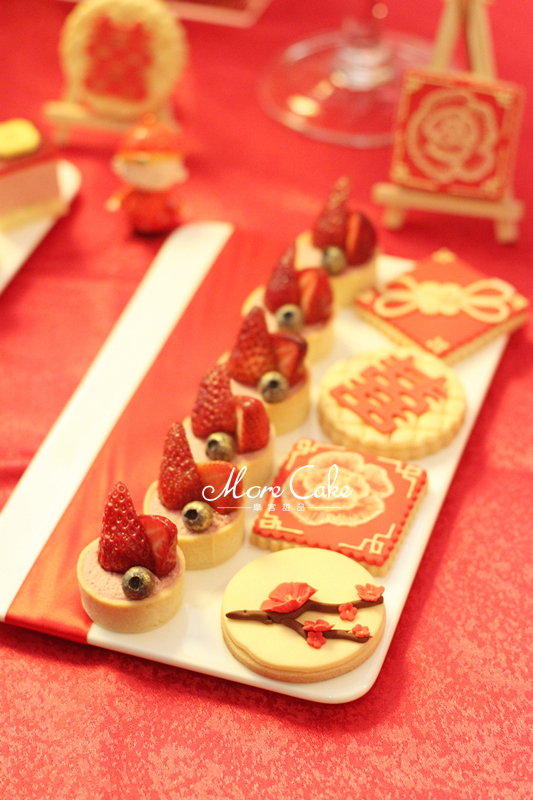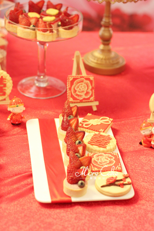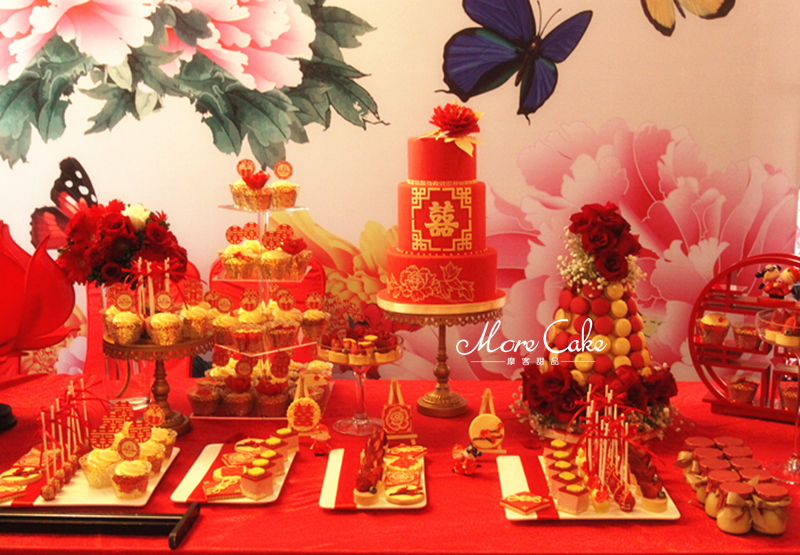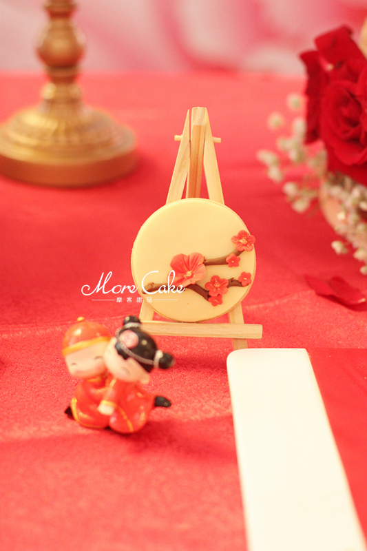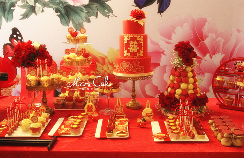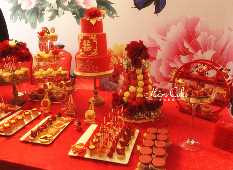 与中规中矩的传统婚宴不同,如今的青年男女喜欢另类的事物,翻糖甜品也是如此。虽然选择了传统的红色,但是融入了卡通的形象,让沉闷和呆板一扫而空。引人注目的多层翻糖蛋糕上,大大的喜字代替了窗花和剪纸,精致的翻糖饼干上,点缀了朵朵桃花,MoreCake用红色喜宴演绎经典。