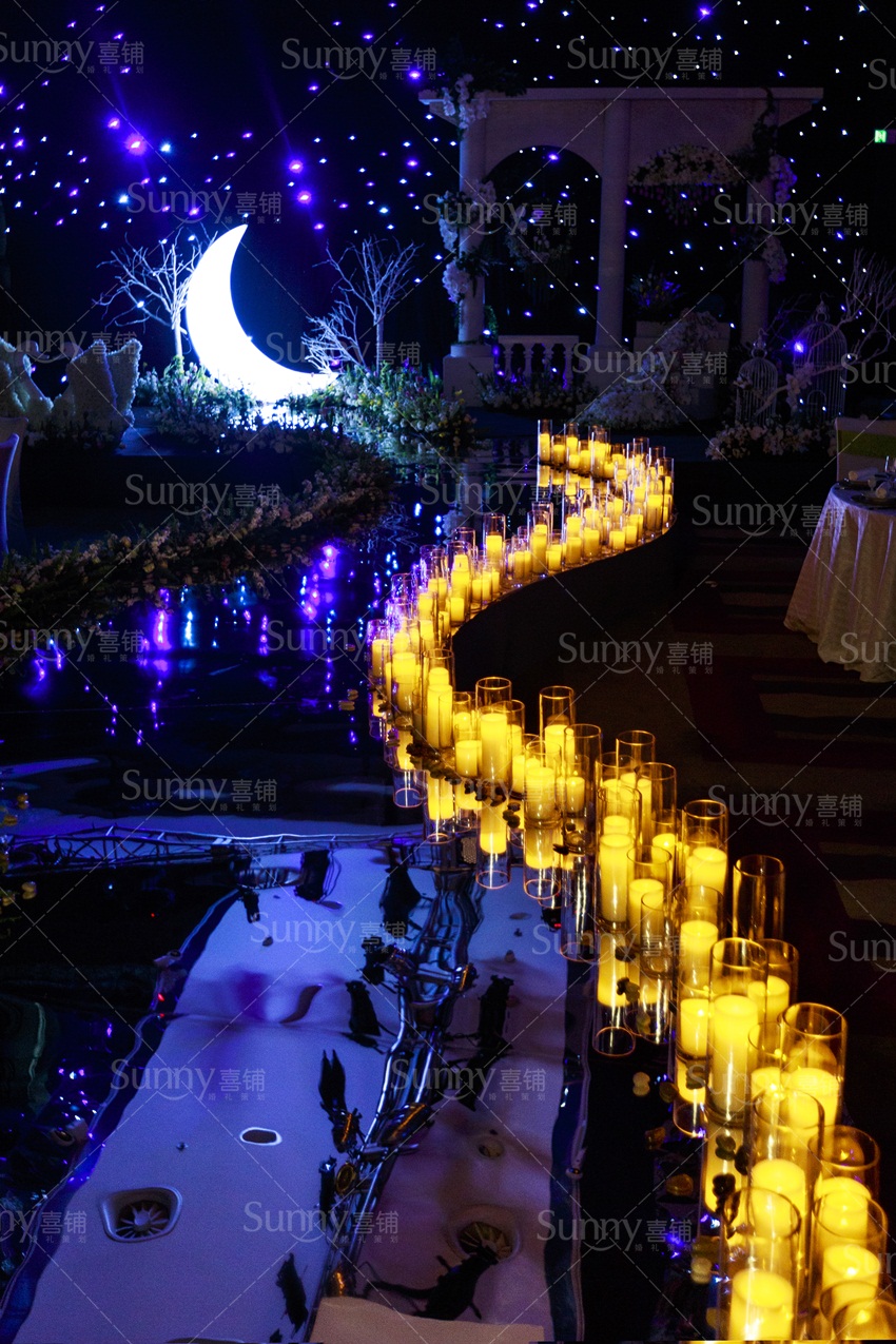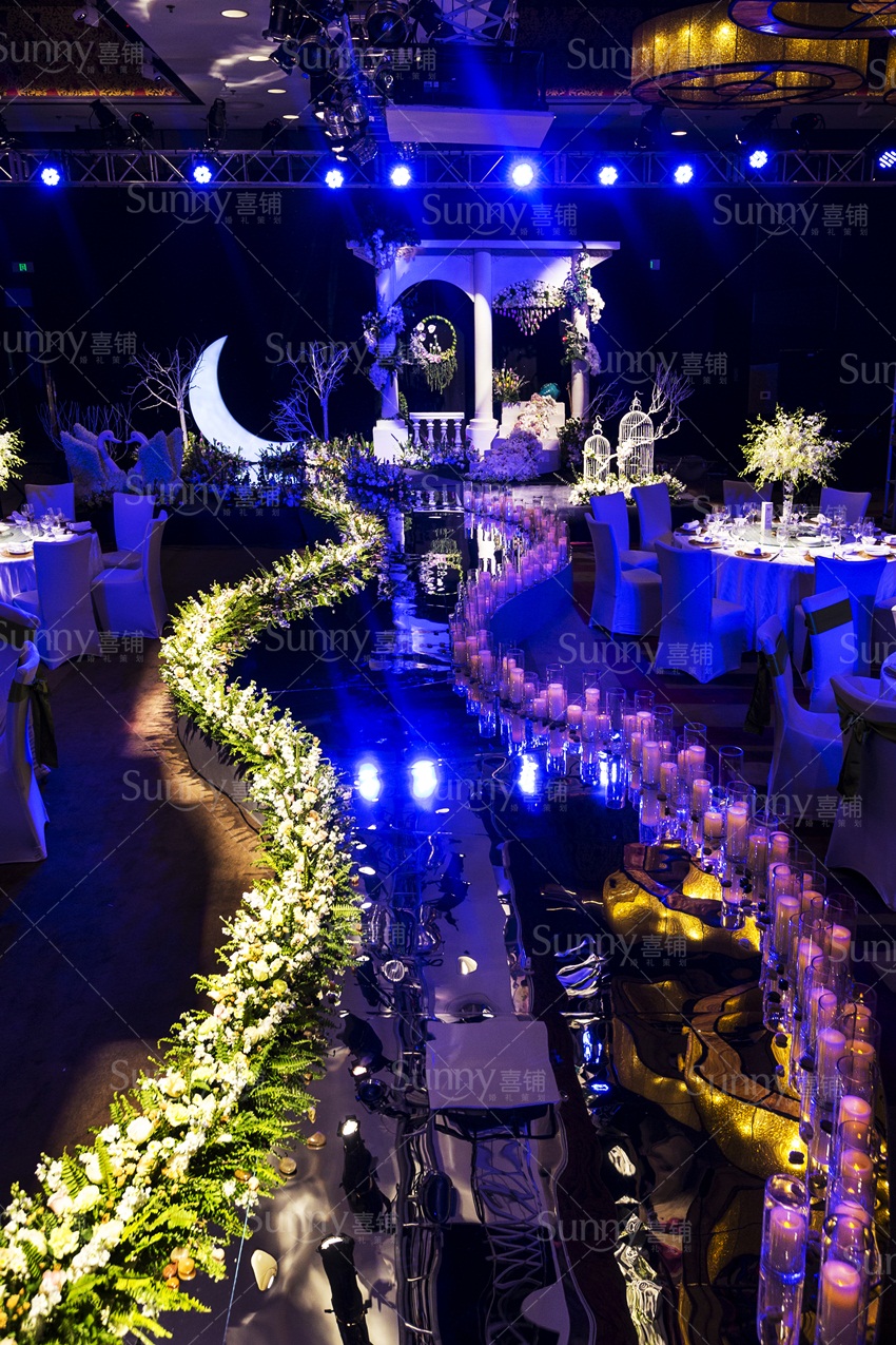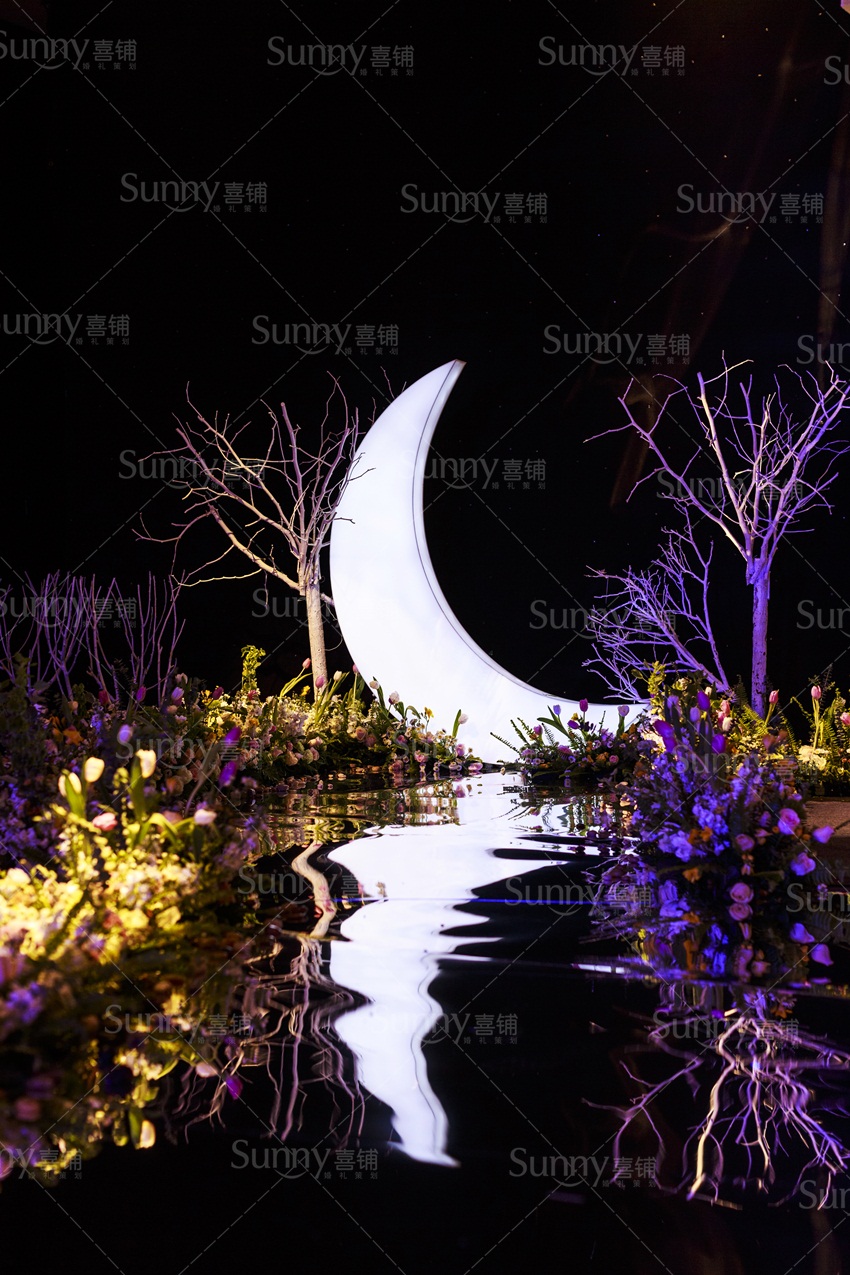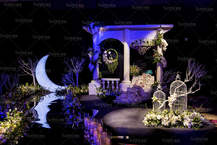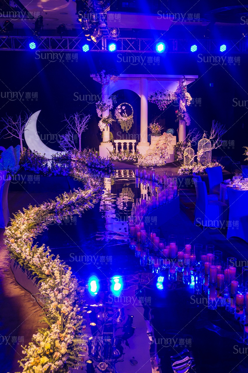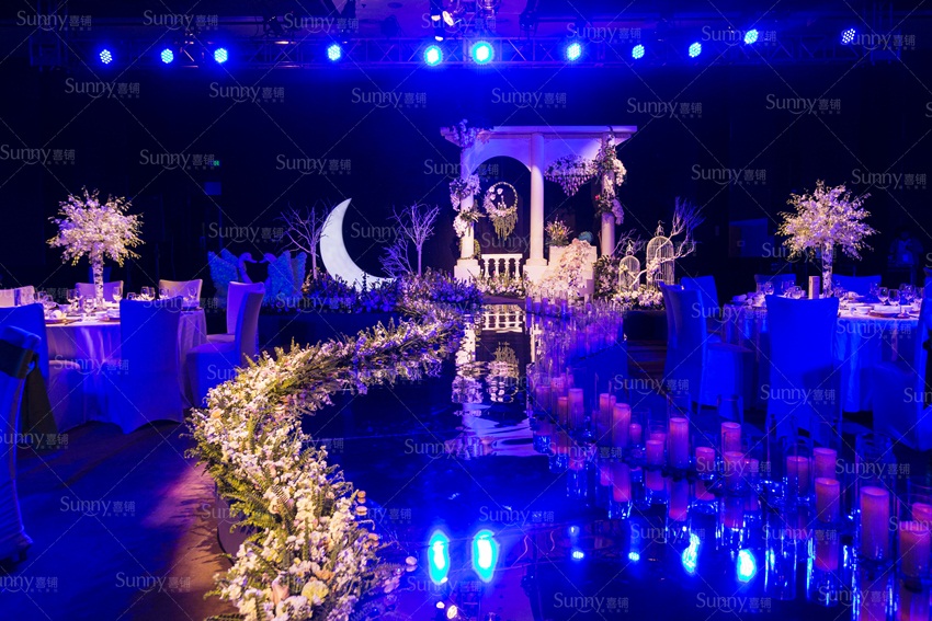 婚礼中蓝色的灯光与月亮完美融合,呈现出宁静的美,鲜花在浪漫的氛围里等待绽放,周围仿佛有无数灯火人家,两颗心紧紧的相拥,每一颗感动的泪水都化作幸福,在月光的见证下,梦回爱乡。