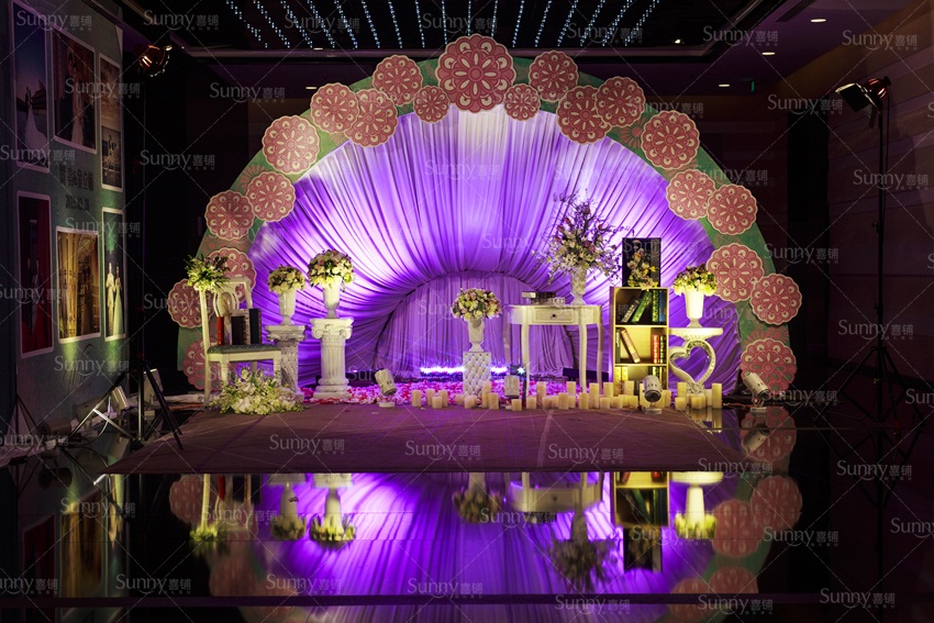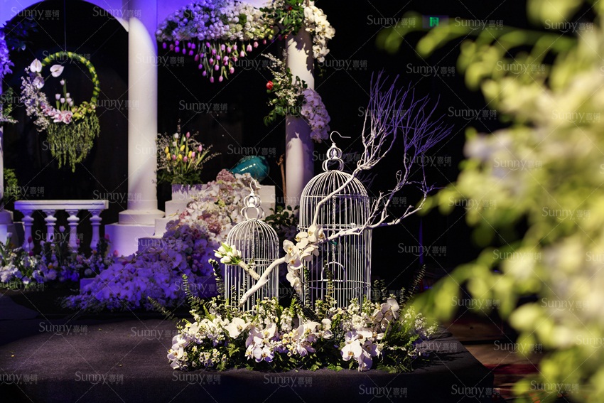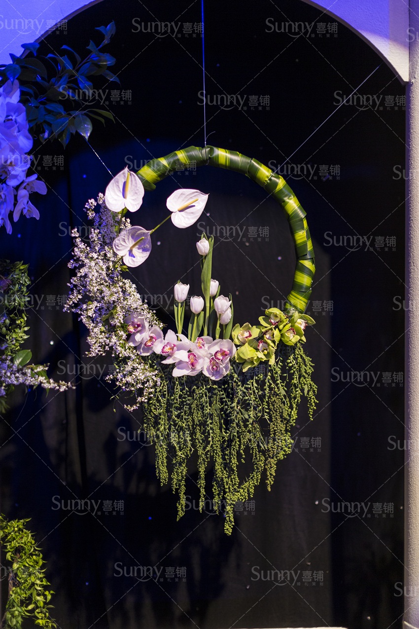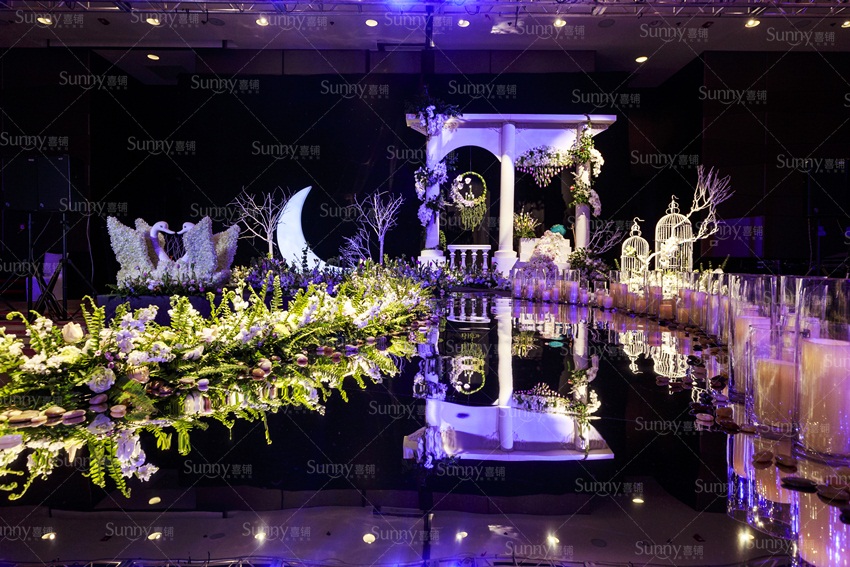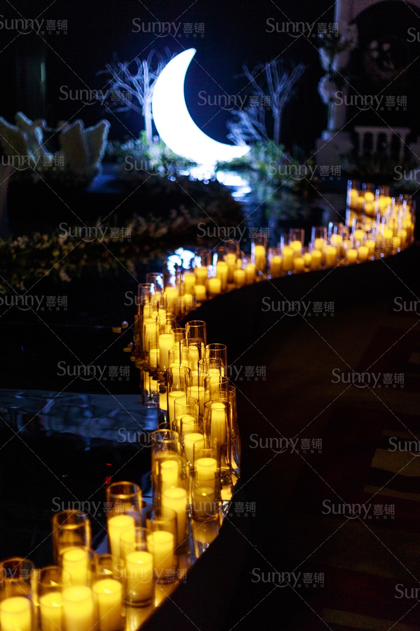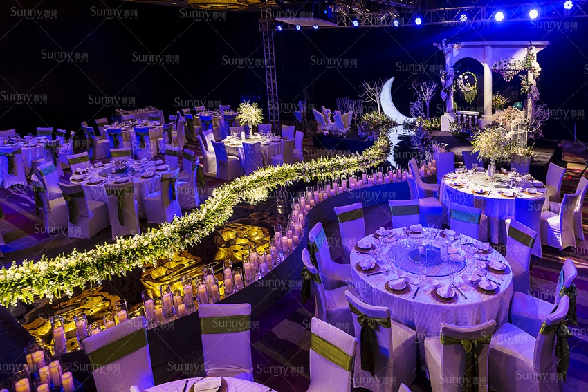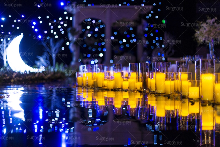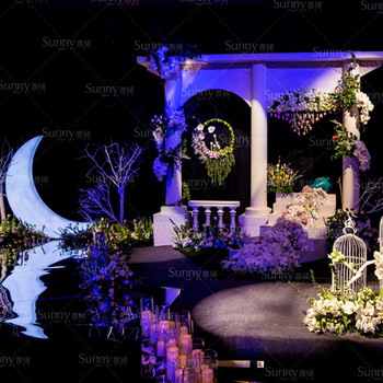 婚礼中蓝色的灯光与月亮完美融合,呈现出宁静的美,鲜花在浪漫的氛围里等待绽放,周围仿佛有无数灯火人家,两颗心紧紧的相拥,每一颗感动的泪水都化作幸福,在月光的见证下,梦回爱乡。