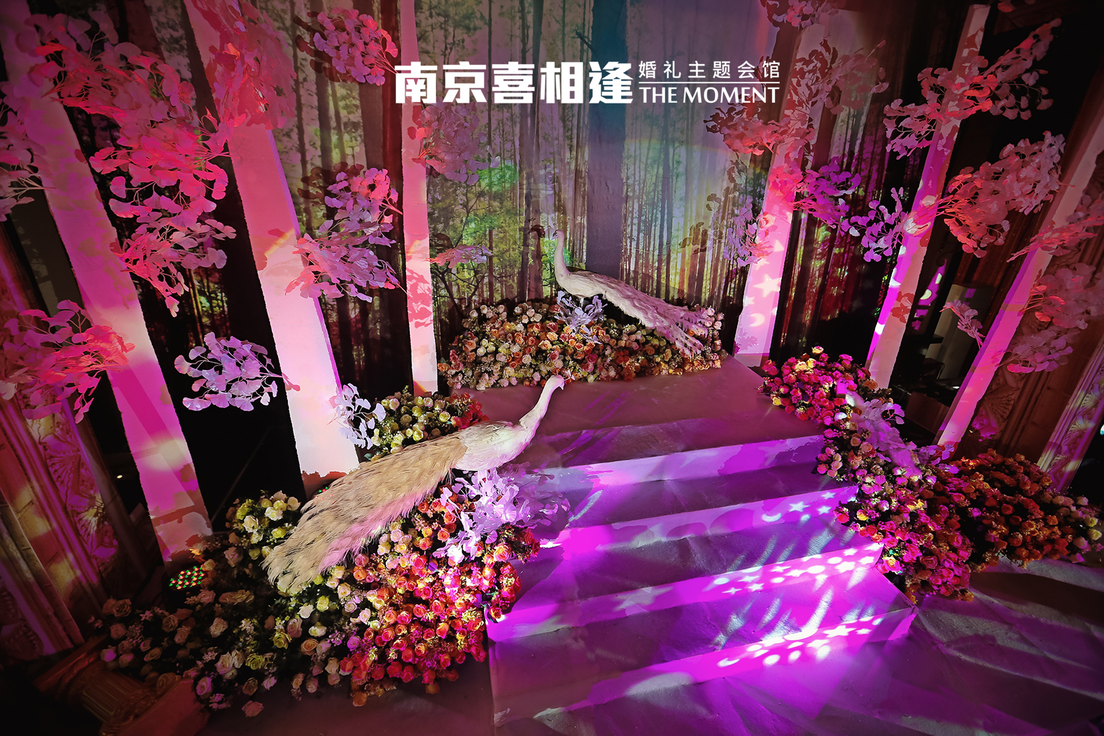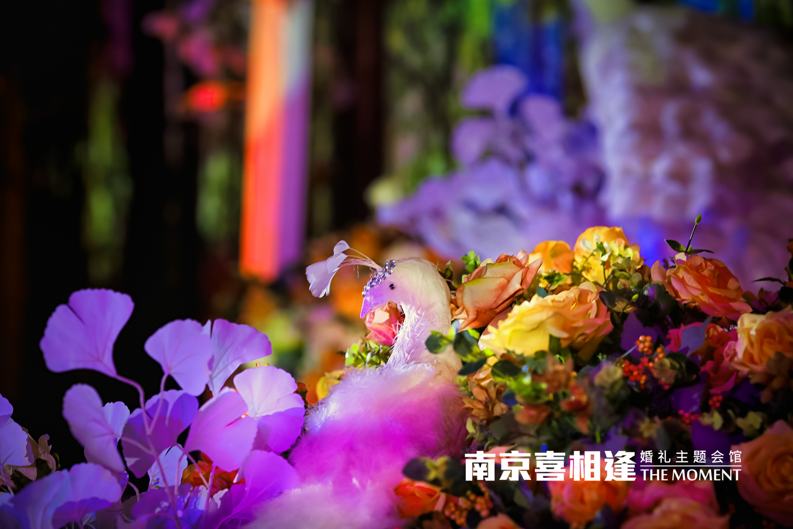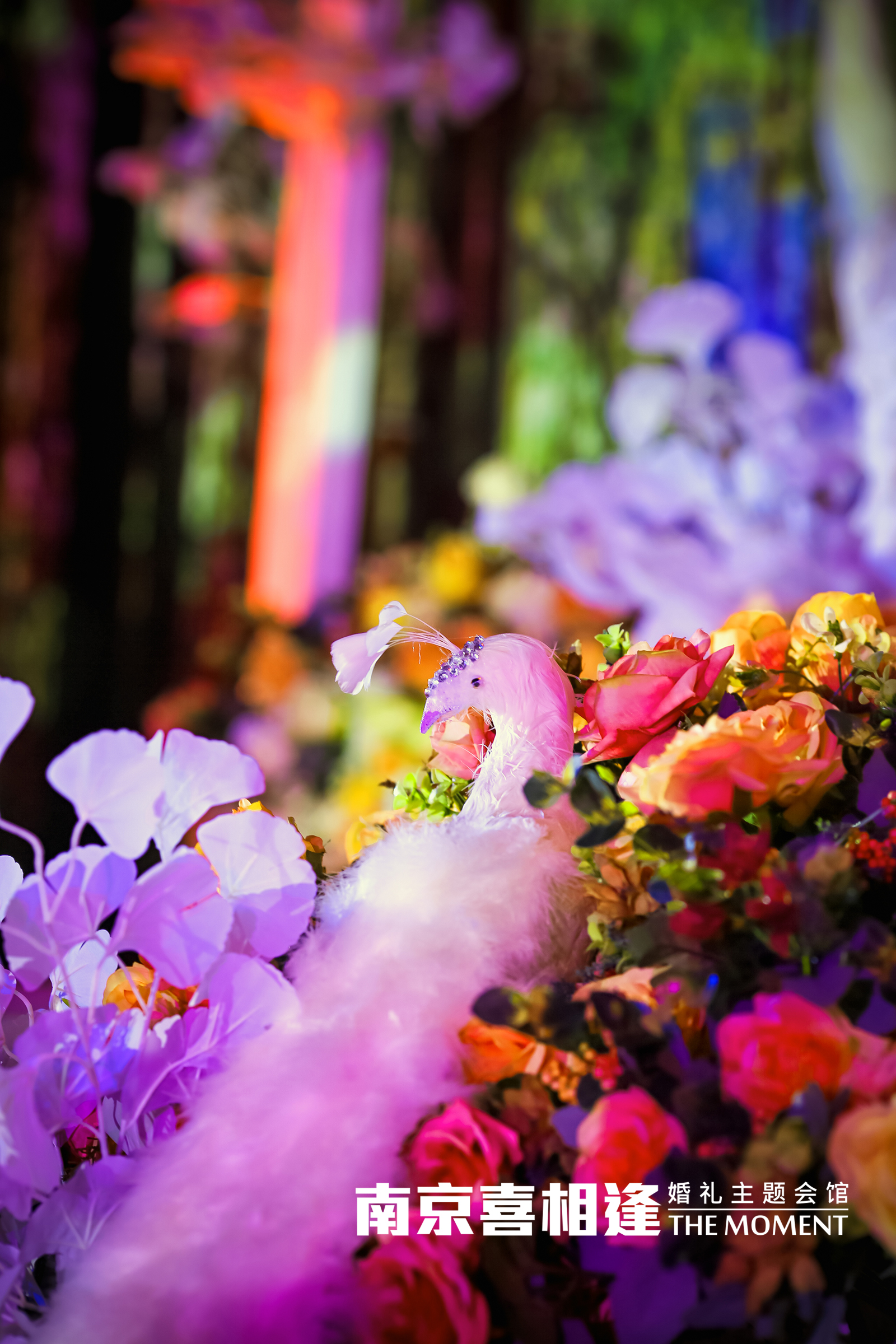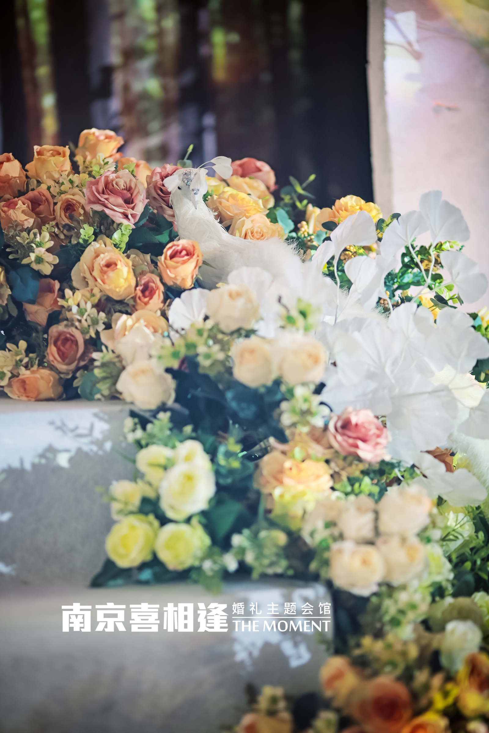 我想象你穿婚纱的样子,就像我初次见你时的心动;就像你靠在我肩膀时的温暖;就像你出现在我生命里的惊喜。我知道,总有一天你会出现的,带上你眼中坚定不移的焦点,找到我。这不,你来了!“我首先想告诉你,我现在特别幸福。我站在这里,这就是我的决心,和我的承诺。”平静里装着的,是温柔和深情,浪漫里存着的,是感动和回忆。柔软的白色纱幔,星星点点的暖色灯光在若隐若现中闪烁着,有种优雅,叫星光里的朦胧。光,寻着树的根,追着叶的影,缠绕着这甜蜜的情感;唯美的银杏树下,郁郁葱葱的花儿,一切都是那么的自然,却又偶然的默契。孔雀是这个世界上最为专情的鸟类,听说白孔雀一生只爱一个人,婚礼上的白孔雀为新人的美好生活开启一段美丽的旅程。