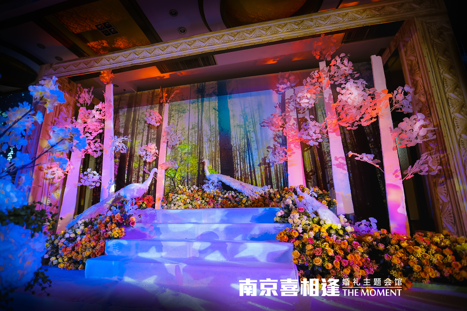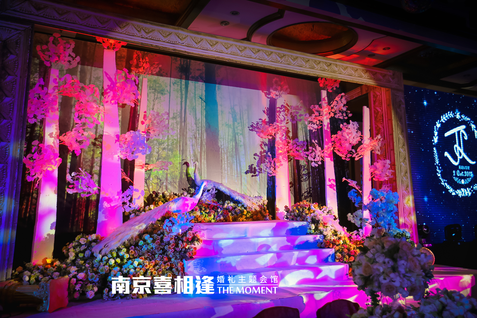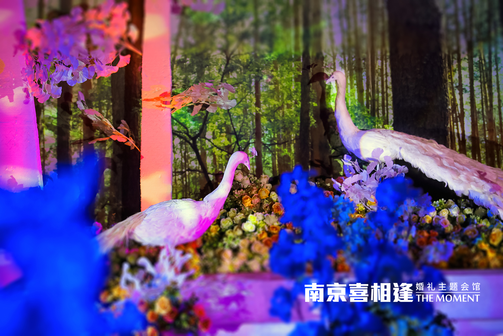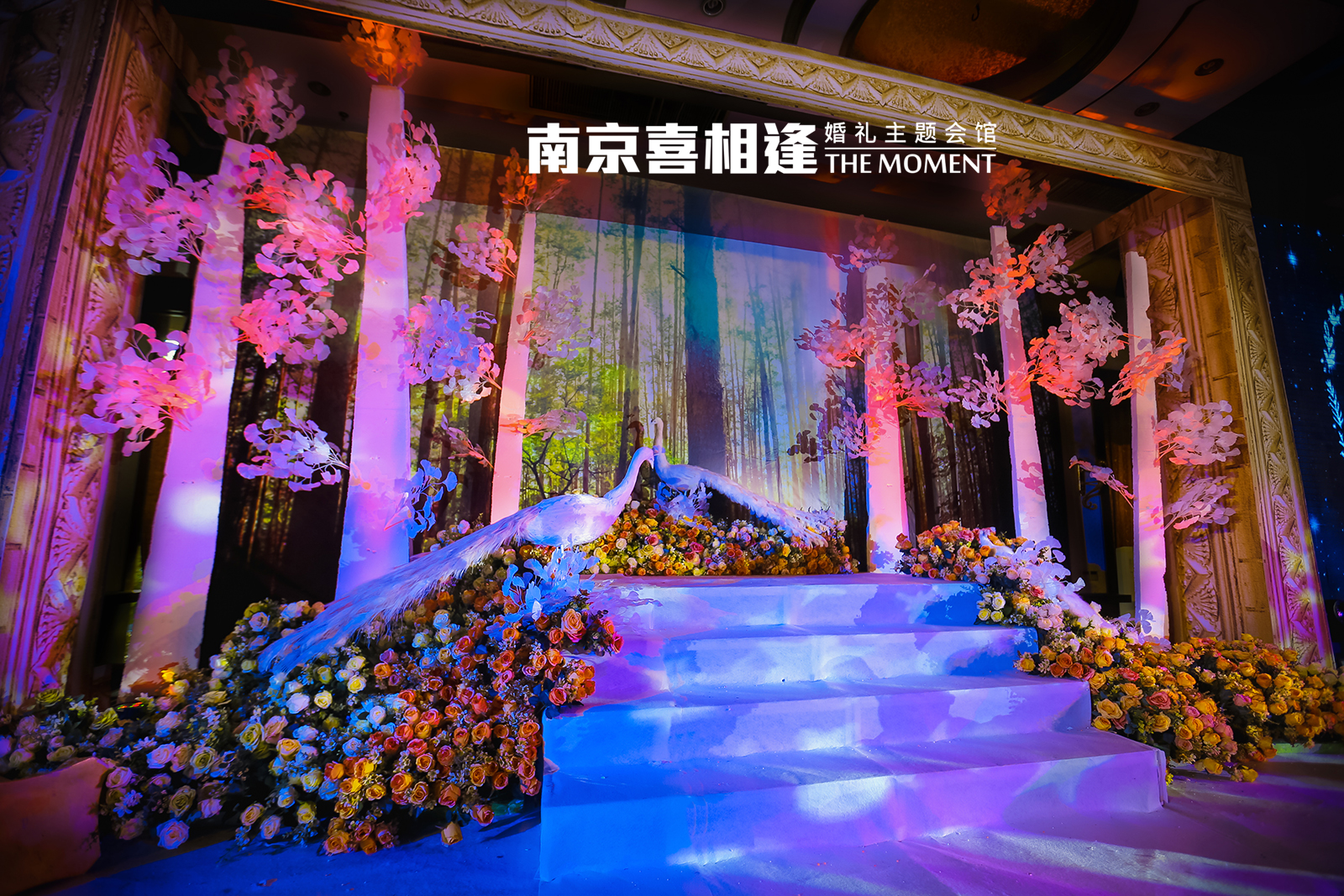 我想象你穿婚纱的样子,就像我初次见你时的心动;就像你靠在我肩膀时的温暖;就像你出现在我生命里的惊喜。我知道,总有一天你会出现的,带上你眼中坚定不移的焦点,找到我。这不,你来了!“我首先想告诉你,我现在特别幸福。我站在这里,这就是我的决心,和我的承诺。”平静里装着的,是温柔和深情,浪漫里存着的,是感动和回忆。柔软的白色纱幔,星星点点的暖色灯光在若隐若现中闪烁着,有种优雅,叫星光里的朦胧。光,寻着树的根,追着叶的影,缠绕着这甜蜜的情感;唯美的银杏树下,郁郁葱葱的花儿,一切都是那么的自然,却又偶然的默契。孔雀是这个世界上最为专情的鸟类,听说白孔雀一生只爱一个人,婚礼上的白孔雀为新人的美好生活开启一段美丽的旅程。