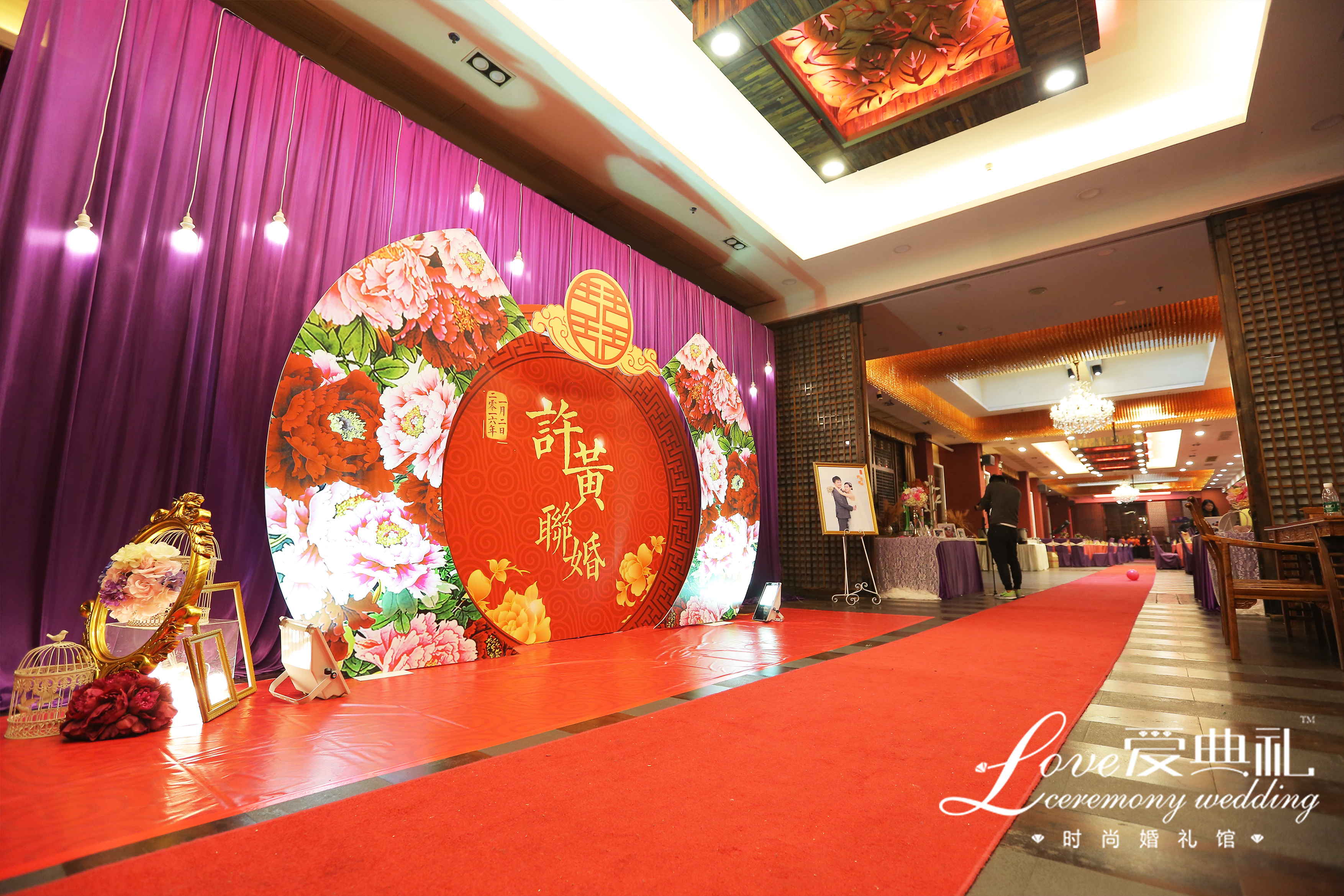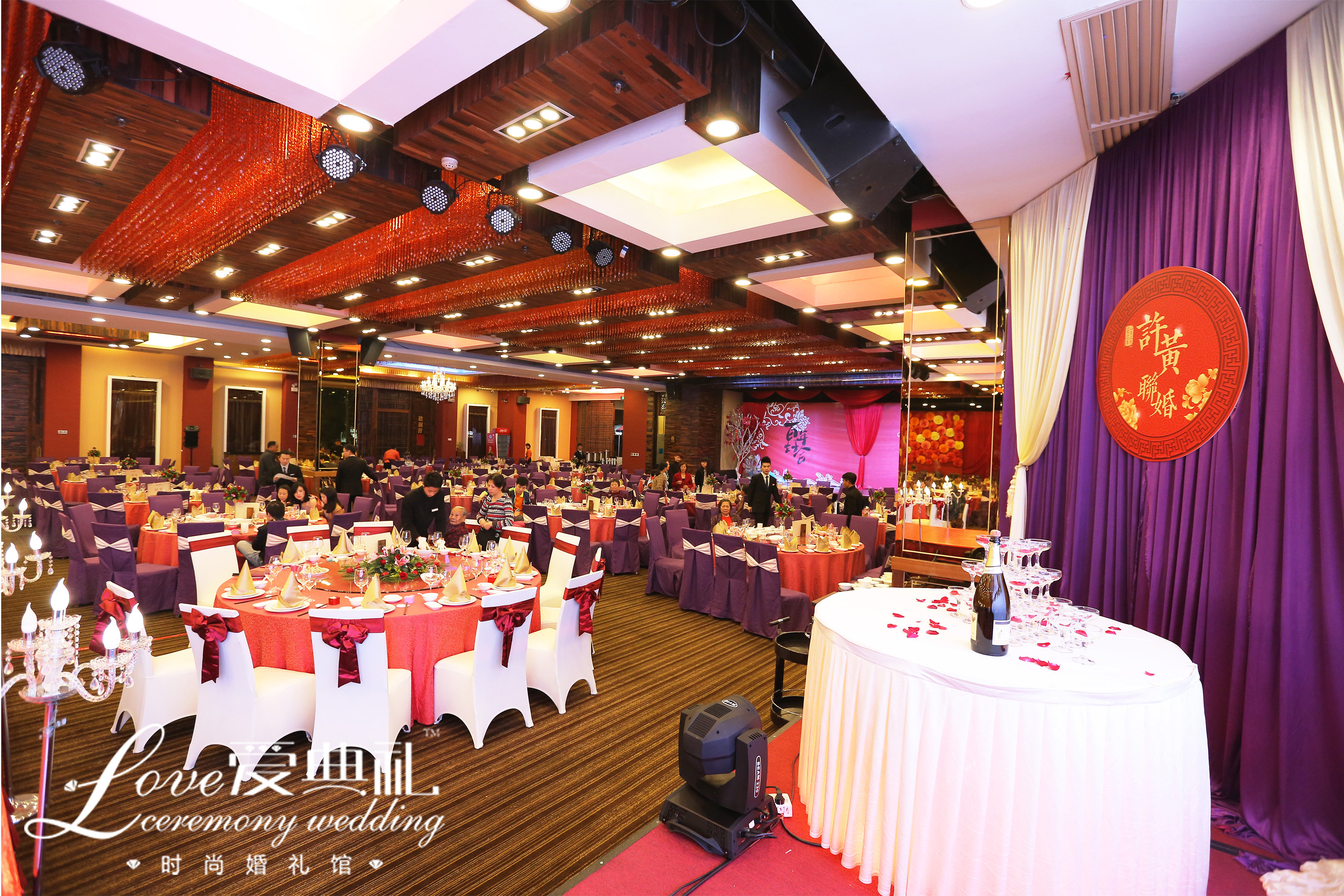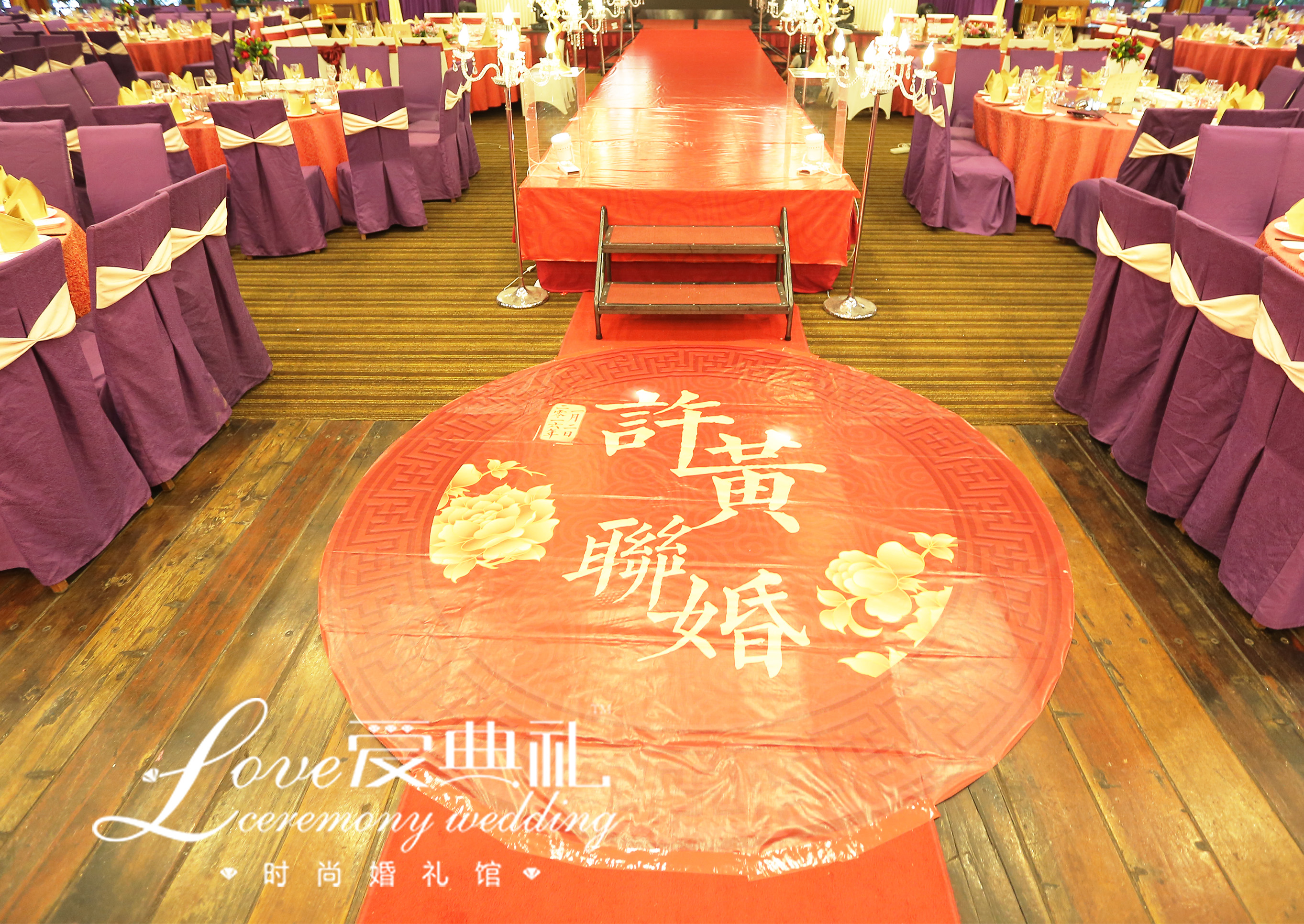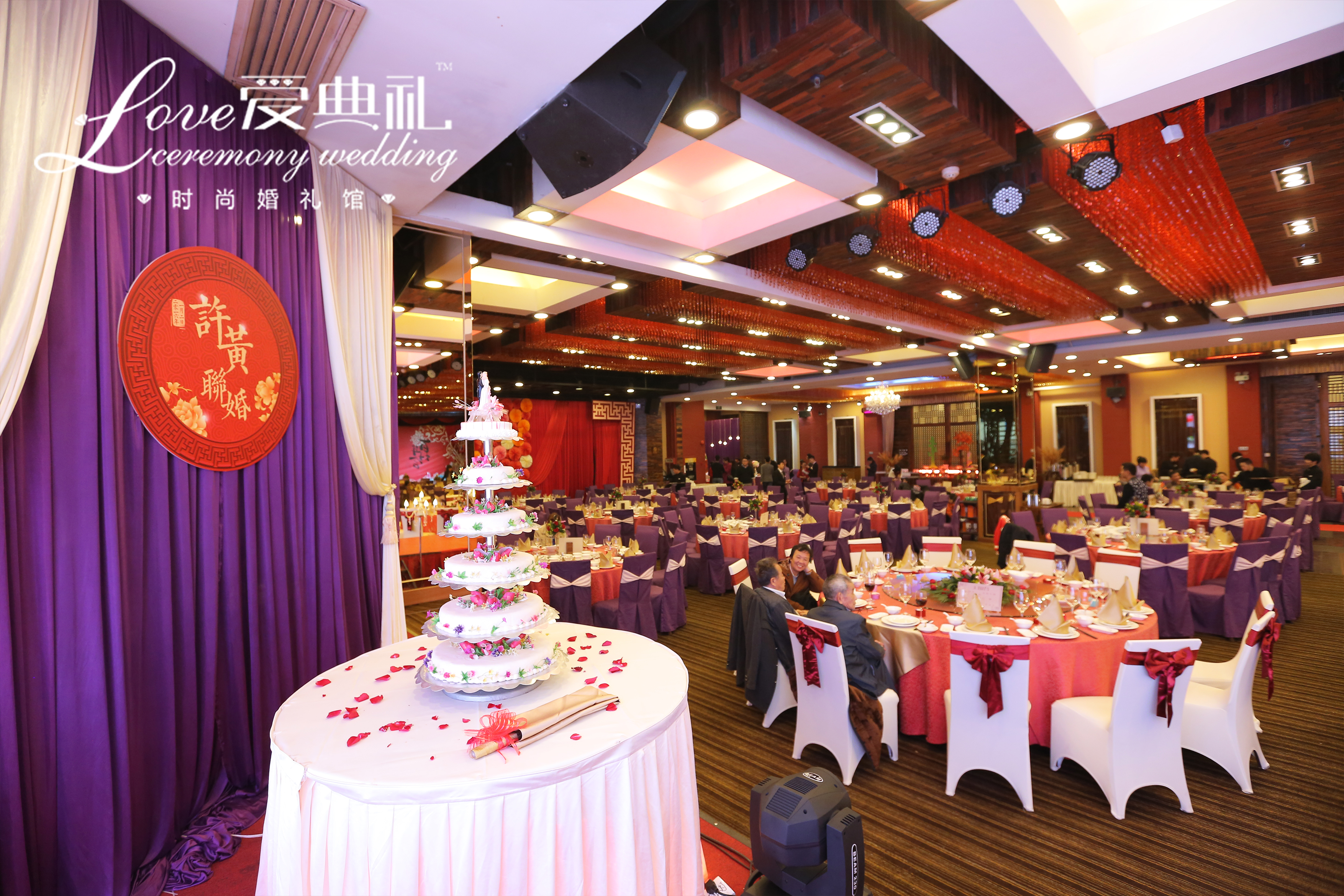 中国红结合高贵紫,大气磅礴,体现新人的相互包容大爱