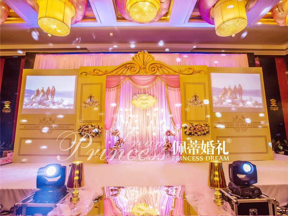 霓光空中旋转,花瓣悠然蔓延,那里没有荆棘与荨麻,只有为你驱赶梦靥的爱的城堡!策划师选用粉色系,代表美丽、活泼的新娘,加入尊贵的金色,给予她公主般的婚礼。整场布置充分与粉、金契合,体现着青春洋溢而不失格调的主题婚礼。