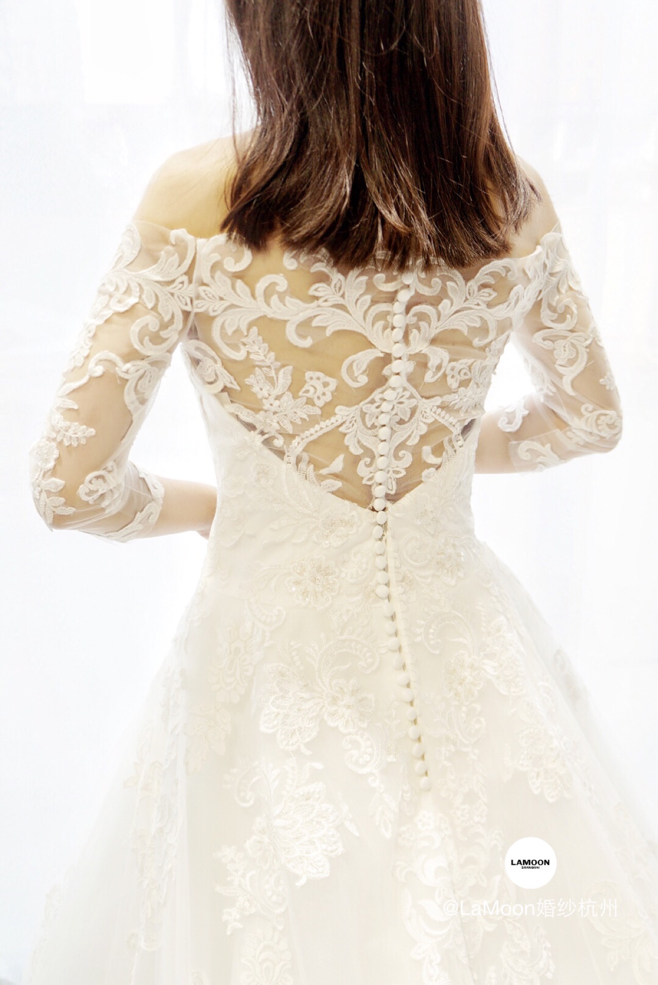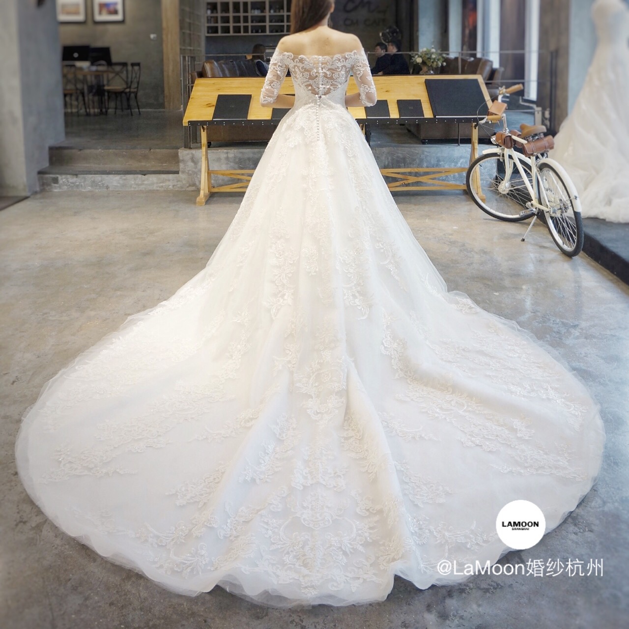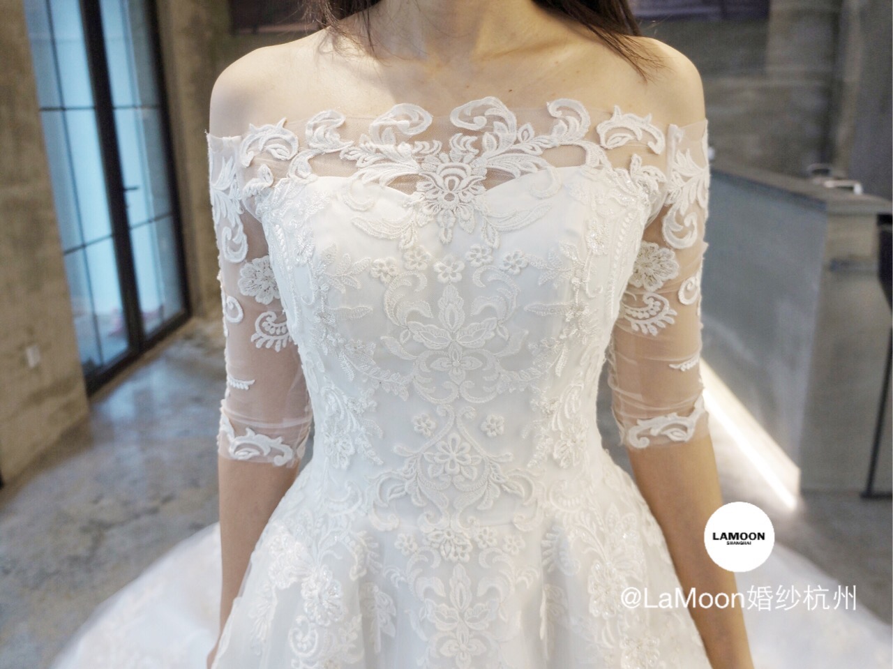 LAMoon婚纱杭州店引进顶级婚纱品牌英国JOYA。新到的一字肩蕾丝大拖尾,整件婚纱布满复古的刺绣蕾丝,蕾丝中镶嵌着珠片,在灯光下犹如波光粼粼闪烁。背面的空纱蕾丝加上排扣更是让人惊艳不已!这样的复古宫廷风你喜欢吗?