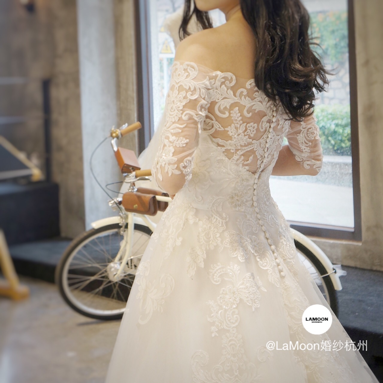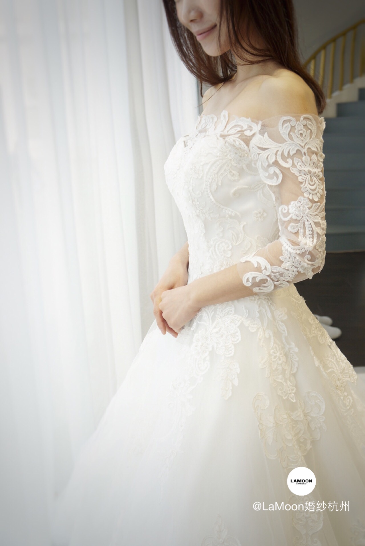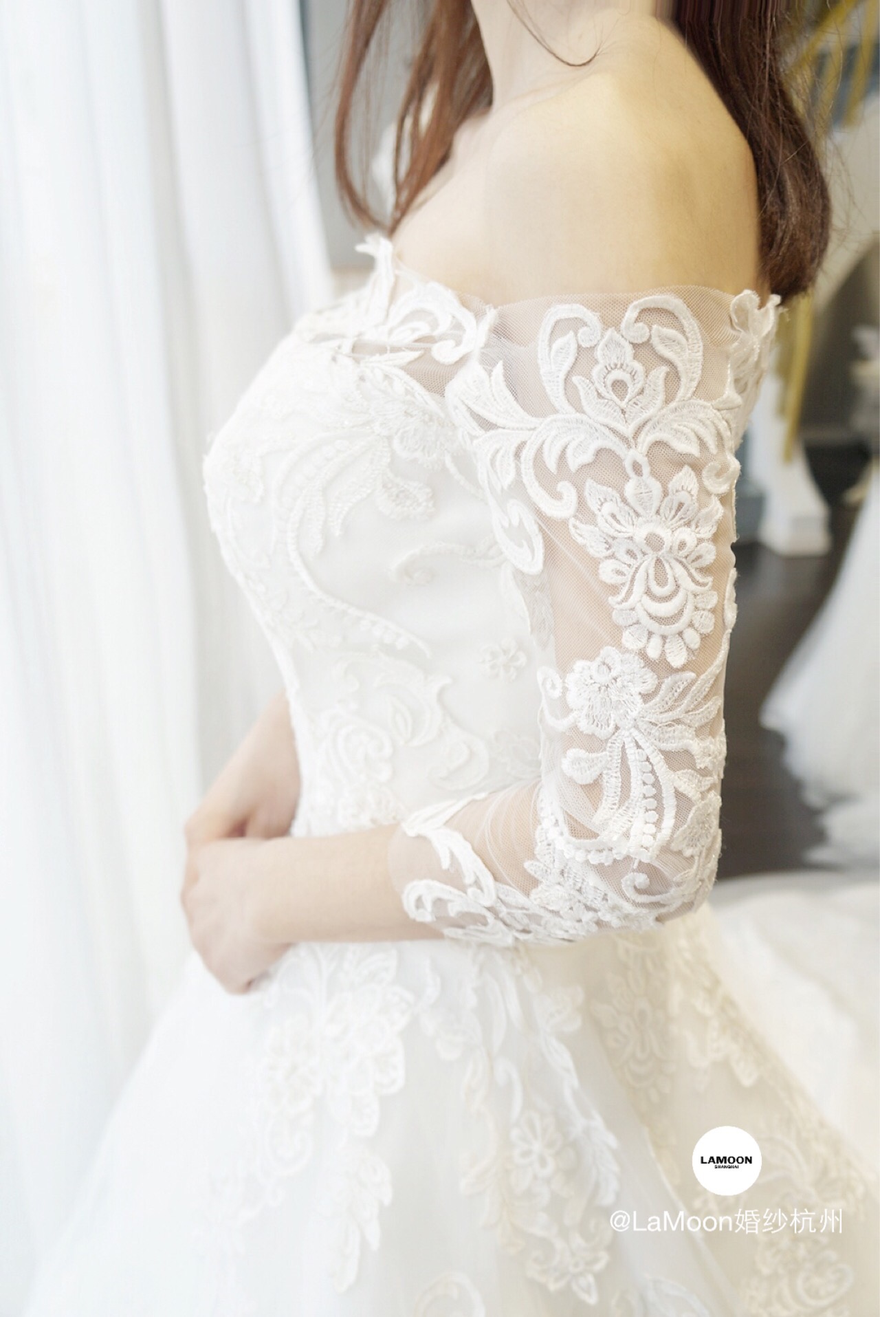 LAMoon婚纱杭州店引进顶级婚纱品牌英国JOYA。新到的一字肩蕾丝大拖尾,整件婚纱布满复古的刺绣蕾丝,蕾丝中镶嵌着珠片,在灯光下犹如波光粼粼闪烁。背面的空纱蕾丝加上排扣更是让人惊艳不已!这样的复古宫廷风你喜欢吗?