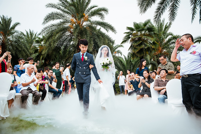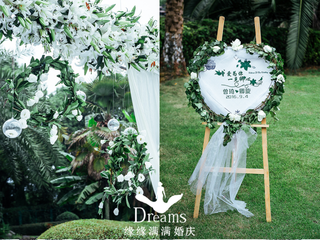 本场婚礼的新人向往自然清新的婚礼风格,特意将户外草坪选为婚礼场地,婚礼仪式区的色调则以清新典雅的代表:白和绿为主。舞台以百合花和纱幔装饰搭建花亭,垂吊透明水晶球和花环,随风而舞,低语着“自在飞花轻似梦”的诗 一帘白纱纷飞了时光的暖意、将心事温婉成一枚素香的心笔、在这清露丰盈嫣红的花季里、写下我们的相遇,那思念的花语,三生石上的情意、只待今日你一句 “我愿意”