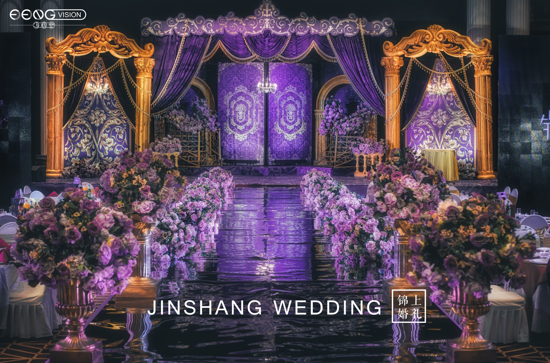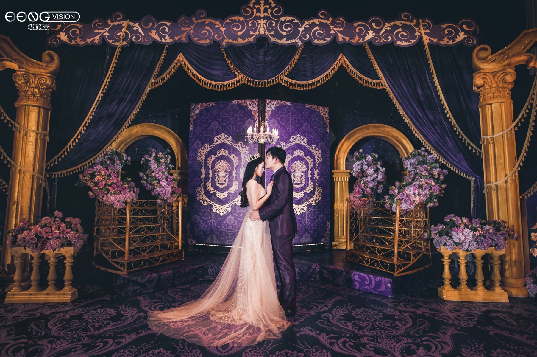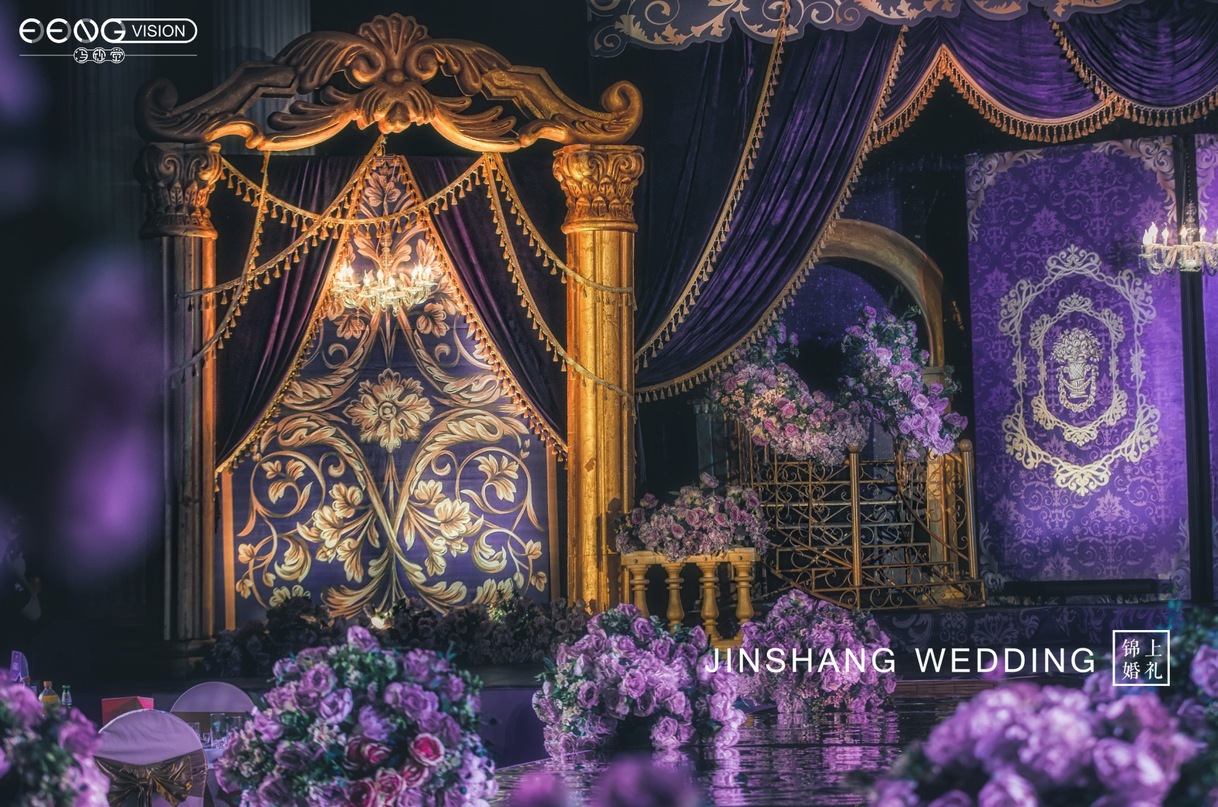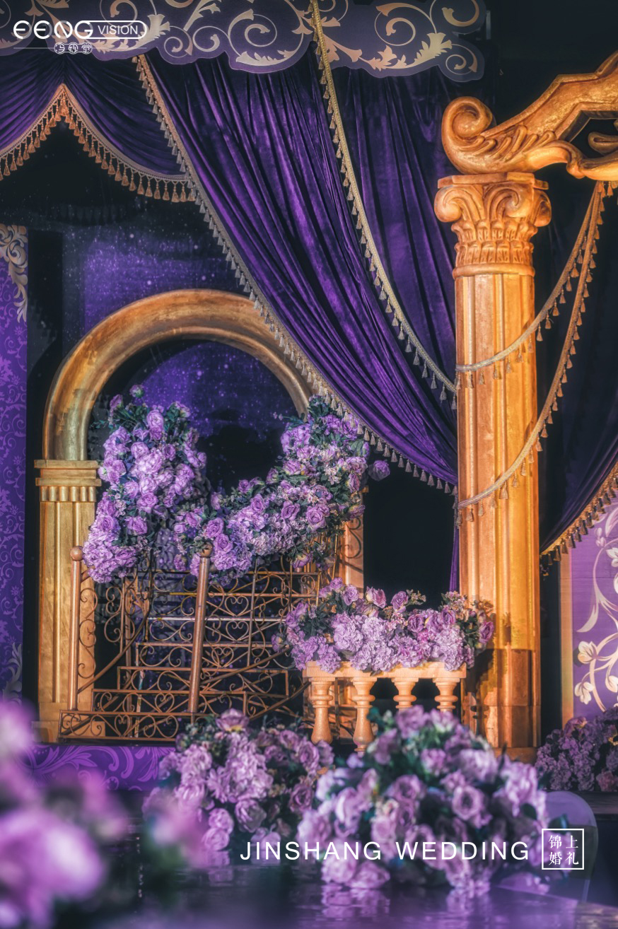 高贵典雅不仅仅是红金色系的专属,深紫色搭配金色也别有一番风味,主舞台幕帘与楼梯的设计都给来宾极大的空间感,仿佛顺着楼梯走进就是另一个世界。对称的罗马柱拱门凸显出异域风情,整场婚礼给人感觉神秘又深邃。