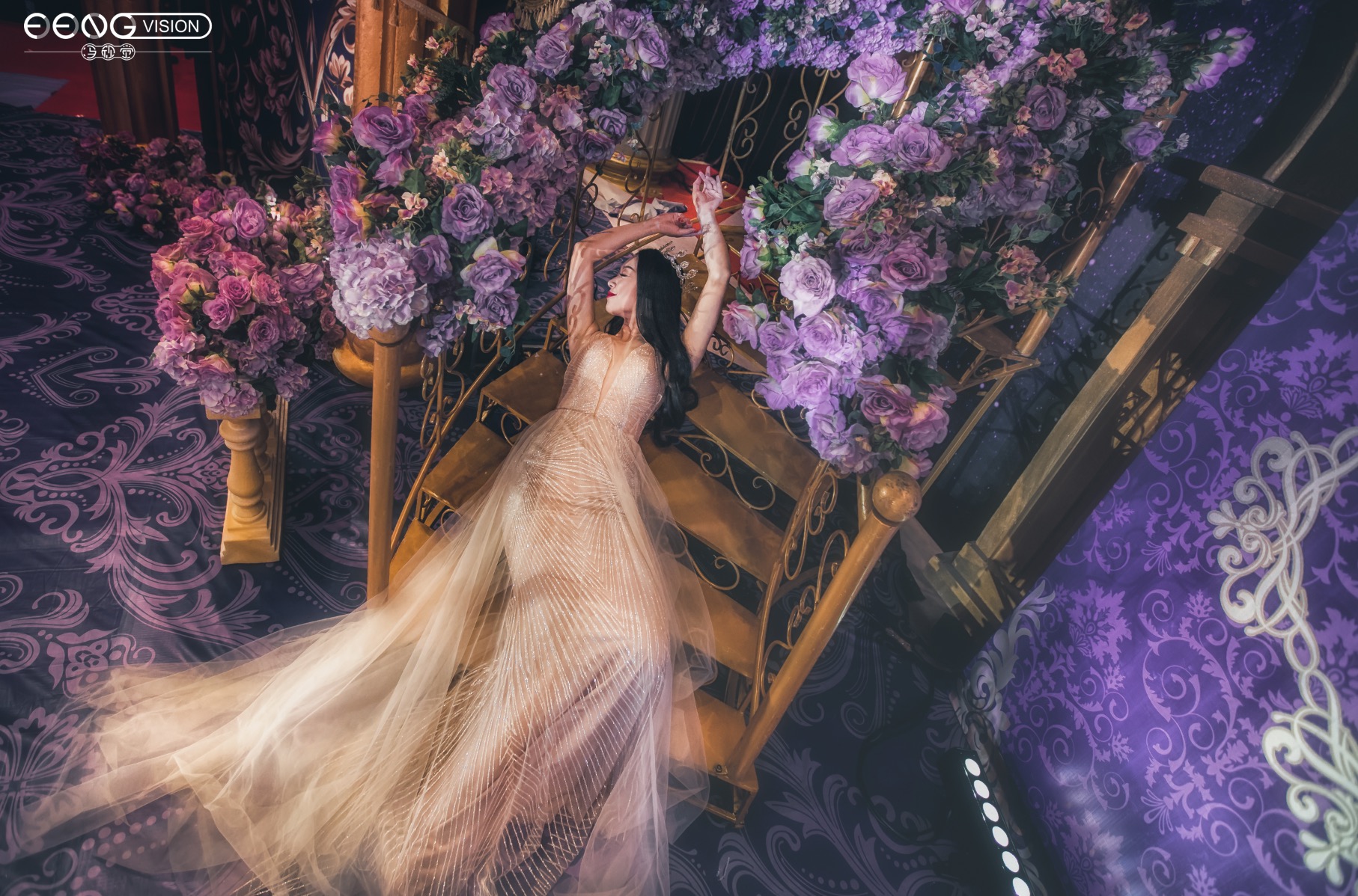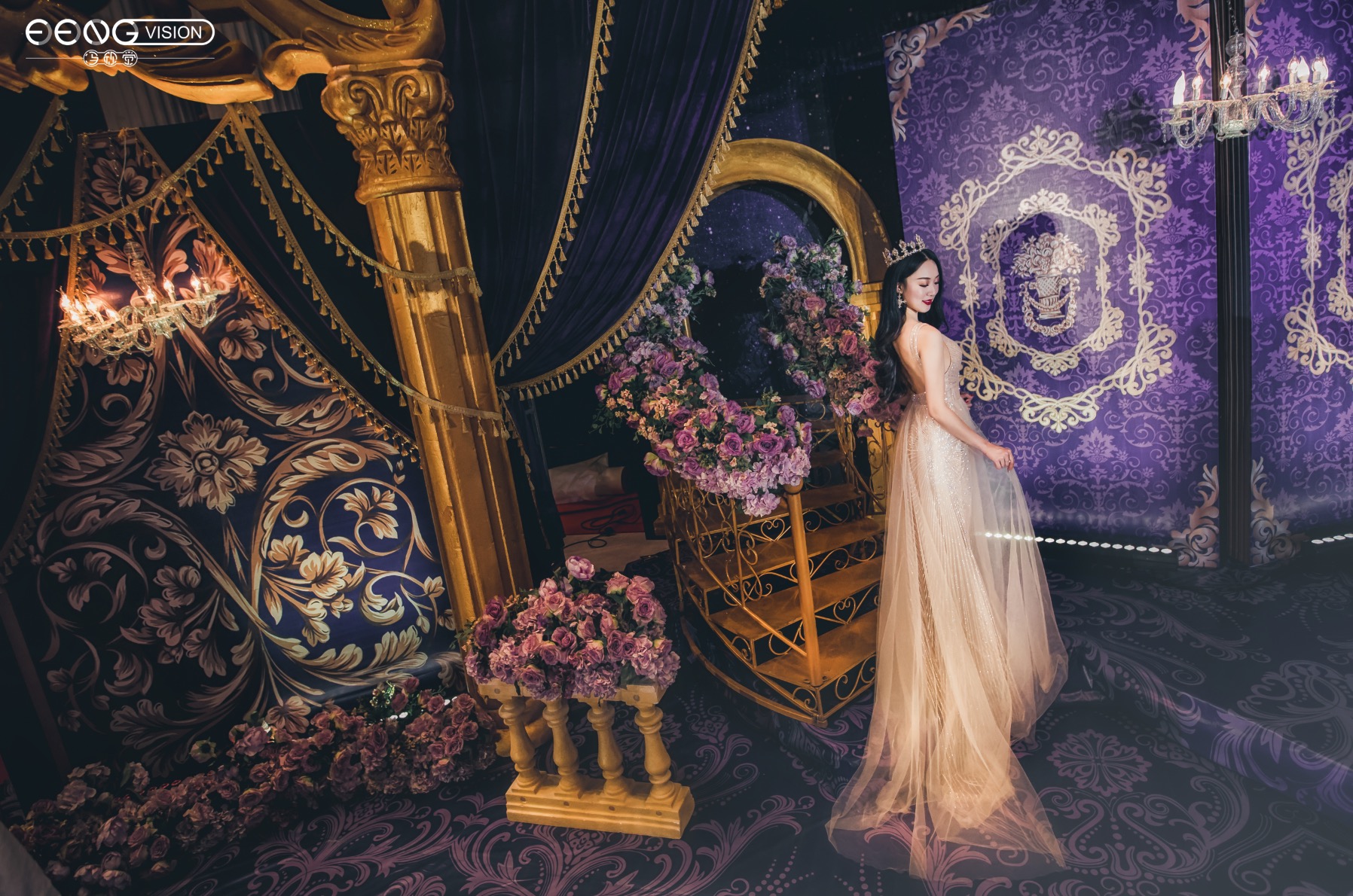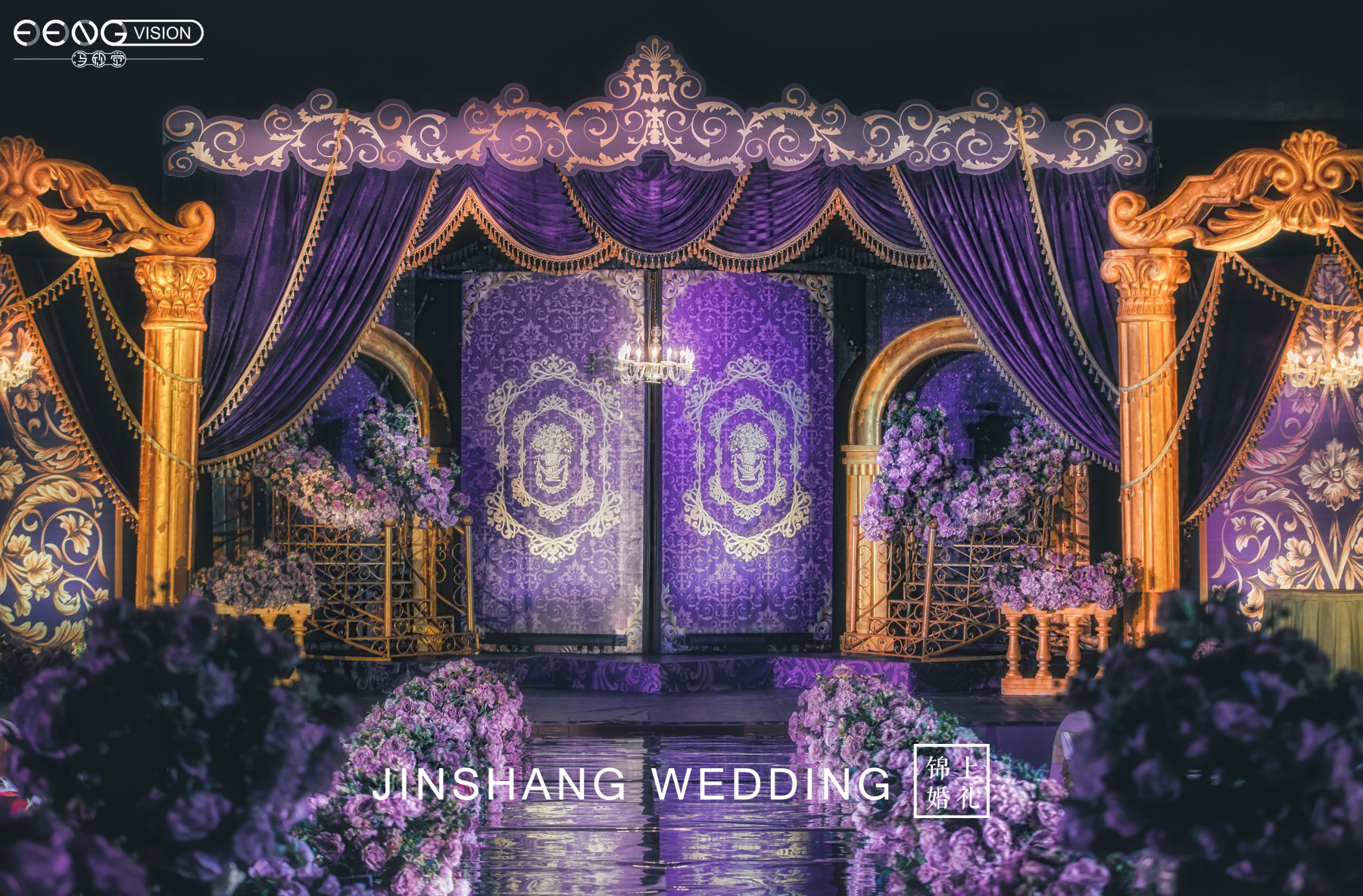 高贵典雅不仅仅是红金色系的专属,深紫色搭配金色也别有一番风味,主舞台幕帘与楼梯的设计都给来宾极大的空间感,仿佛顺着楼梯走进就是另一个世界。对称的罗马柱拱门凸显出异域风情,整场婚礼给人感觉神秘又深邃。